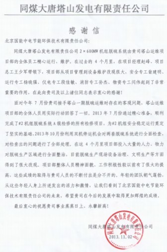 當前位置: 國能中電公司動態> 塔山項目感謝信