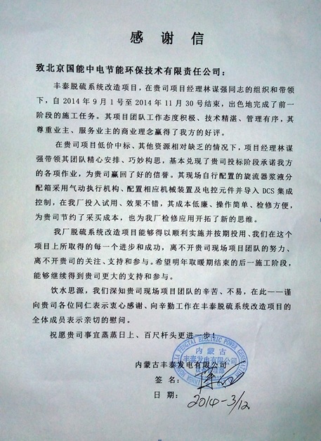 當(dāng)前位置: 國能中電公司動(dòng)態(tài)> 內(nèi)蒙古豐泰脫硫系統(tǒng)改造EPC項(xiàng)目受業(yè)主表揚(yáng)